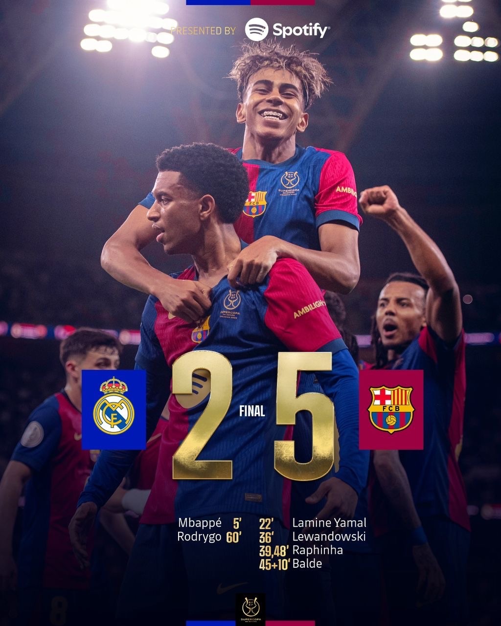 Dans une performance éclatante, le FC Barcelone a triomphé sur le Real Madrid avec un score de 5-2, s’emparant ainsi de la Supercoupe d’Espagne. Ce