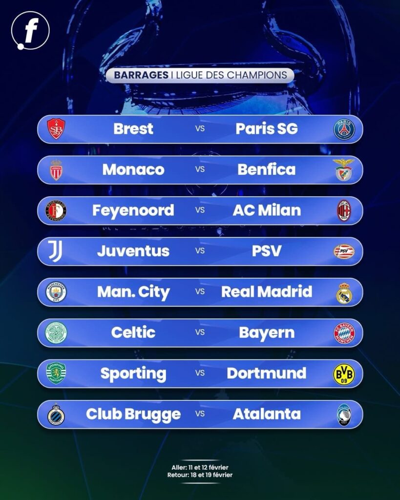 Le tirage au sort des barrages de la phase à élimination directe de la Ligue des Champions a effectué le vendredi 31 janvier 2025.L’affiche sensationnelle
