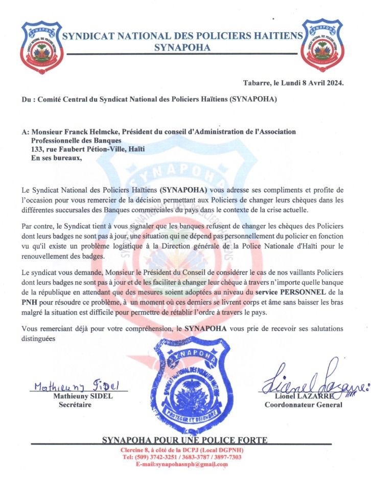 L’Association Professionnelle des Banques (APB) a décidé, selon des informations rapportées par le Syndicat National des Policiers Haïtiens (SYNAPOHA) le lundi 8 avril 2024, d’autoriser les policiers dont les badges ne sont pas encore renouvelés à changer leurs chèques dans n’importe quelle succursale bancaire.