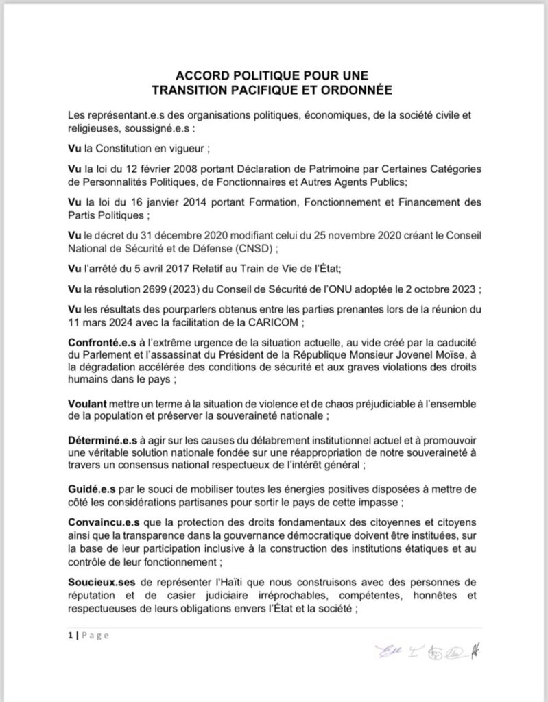 Les partis politiques et la société civile ont signé un accord politique sur la transition, confiant la gestion au Conseil Présidentiel, un gouvernement dirigé par un Premier ministre et l’Organe de Contrôle de l’Action Gouvernementale.
