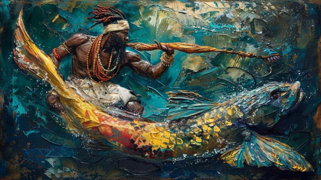 La figure d’Agwe incarne l’interconnexion entre la nature et la spiritualité dans la culture haïtienne, rappelant l’importance de respecter et de vivre en harmonie avec les éléments qui entourent et soutiennent la vie quotidienne.