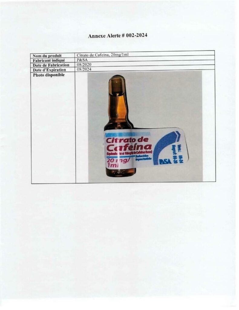 Le ministère de la Santé publique et de la Population (MSPP) tire la sonnette d’alarme concernant la présence d’un médicament contrefait sur le marché haïtien. Il s’agit du « Citrato de Cafeina », un produit frauduleux qui met en péril la santé des citoyens. Cette alerte vise à informer et à sensibiliser la population en général, ainsi que les professionnels de la santé, sur les risques associés à l’utilisation de ce médicament contrefait.