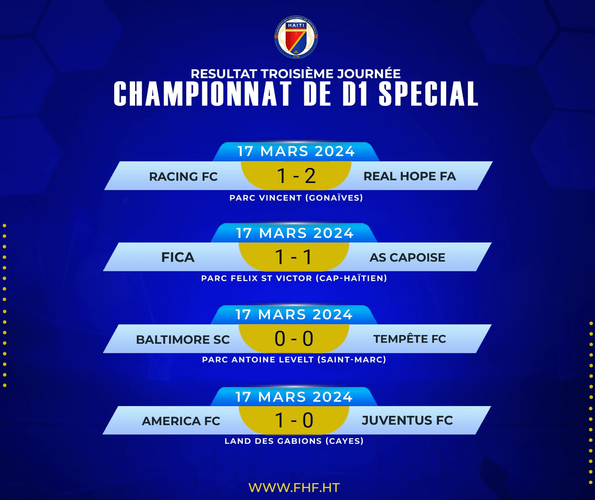 Le championnat national spécial de la Fédération haïtienne de football (FHF) a poursuivi son cours hier dimanche, avec le déroulement de la troisième journée. Trois