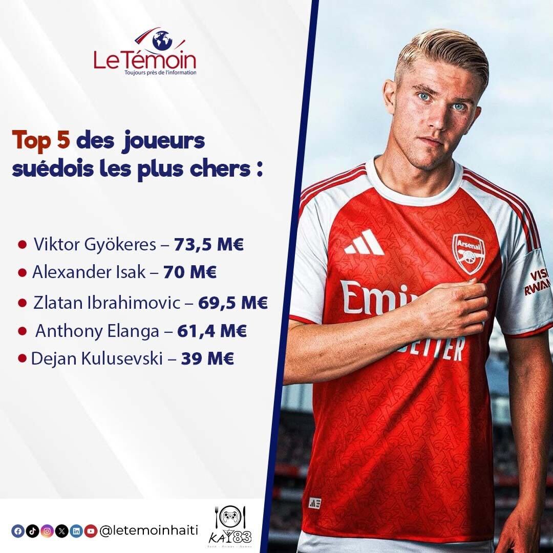 Top 5 des joueurs suédois les plus chers : Viktor Gyökeres – 73,5 M€ Alexander Isak – 70 M€ Zlatan Ibrahimovic – 69,5 M€ Anthony Elanga – 61,4