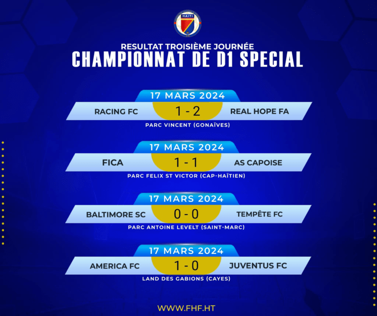 Le championnat national spécial de la Fédération haïtienne de football (FHF) a poursuivi son cours hier dimanche, avec le déroulement de la troisième journée. Trois derbys étaient à l’affiche, opposant le FICA à l’ASC (1-1), le Baltimore au Tempête (0-0), et l’America des Cayes à la Juventus (1-0). Dans l’autre match de la journée, le Real du Cap a battu le Racing des Gonaïves au parc Vincent par 2 buts à 1.