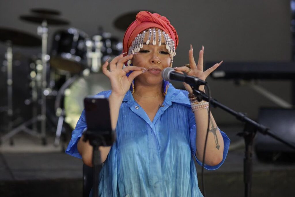Accompagnée de son tambour, Riva a guidé l’assemblée à travers des exercices vocaux qui favorisaient à la fois la cohésion du groupe et l’expression individuelle. Chaque participant a pu s’immerger pleinement dans l’univers musical, démontrant que la voix humaine est un instrument capable de dépasser les barrières linguistiques et culturelles.