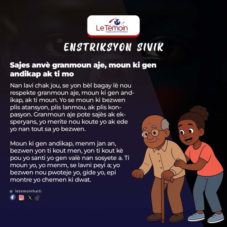 Nan lavi chak jou, se yon bèl bagay lè nou respekte granmoun aje, moun ki gen andikap, ak ti moun. Yo se moun ki bezwen plis atansyon, plis lanmou, ak plis konpasyon. Granmoun aje pote sajès ak eksperyans, yo merite nou koute yo ak ede yo nan tout sa yo bezwen. Moun ki gen andikap, menm jan an, bezwen yon ti kout men, yon ti kout kè pou yo santi yo gen valè nan sosyete a. Ti moun yo, yo menm, se lavni peyi a; yo bezwen nou pwoteje yo, gide yo, epi montre yo chemen ki dwat.