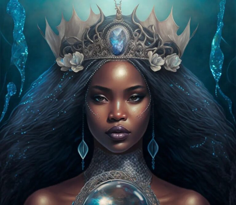 Agwe, le dieu de l’eau dans la religion vaudou haïtienne, est vénéré pour sa domination sur la mer et la vie marine. Marié à La Sirène, une belle sirène, il est connu pour sa nature méticuleuse et son esprit militaire. Au cœur de la mythologie d’Agwe se trouve son union avec La Sirène, la sirène enchanteresse dont l’allure et la sagesse reflètent les profondeurs de l’océan qu’elles gouvernent toutes deux. Leur partenariat illustre l’équilibre harmonieux entre les énergies masculines et féminines dans le domaine aquatique, mettant l’accent sur l’interaction des forces complémentaires dans la cosmologie vaudou.