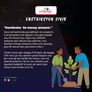 Li enpòtan tou pou nou pa neglije aspè moral ak sivik nan edikasyon timoun nou yo. Pandan vakans, nou ka pran tan pou pale avè yo sou valè tankou respè, onètete, konpasyon, lanmou pou peyi, ak enpòtans pou kontribye nan devlopman sosyete a. Se pa lè lekòl rekòmanse sèlman pou nou panse a lavni yo. Se chak jou, chak aksyon, chak moman nou pase avè yo ki konte.